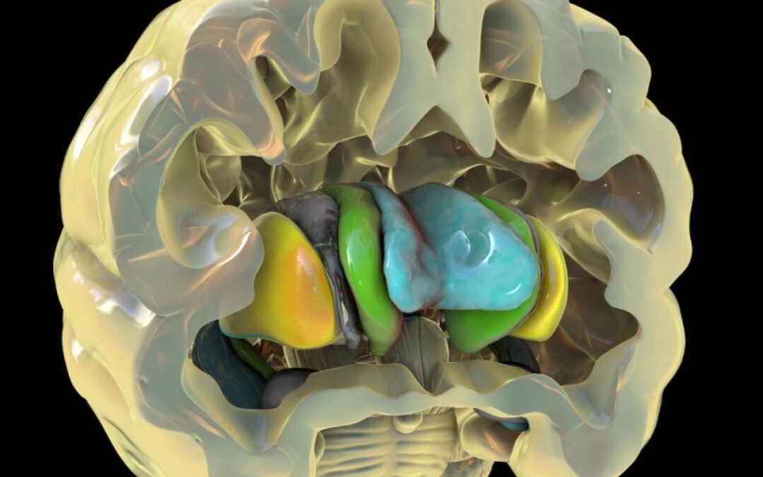 El núcleo caudado (verde) es una región subcortical del cerebro ubicada en el cuerpo estriado. El cuerpo estriado es una de varias estructuras neuronales que forman los ganglios basales (áreas coloreadas) ubicadas debajo de la corteza cerebral. Se estima que el 80 por ciento de la dopamina en el cerebro pasa a través de las neuronas dopaminérgicas del cuerpo estriado. Striatal significa «relacionado con el cuerpo estriado». Dopaminérgico significa «que involucra dopamina».